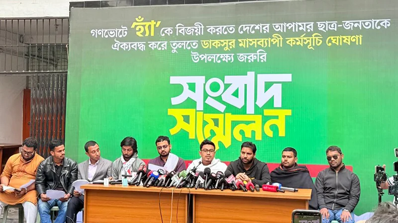 আসন্ন জাতীয় সংসদ নির্বাচন ও গণভোটে ‘হ্যাঁ’ ভোটকে বিজয়ী করতে মাসব্যাপী ১৫টি কর্মসূচি ঘোষণা করেছে ঢাকা বিশ্ববিদ্যালয় কেন্দ্রীয় ছাত্র সংসদ (ডাকসু)।