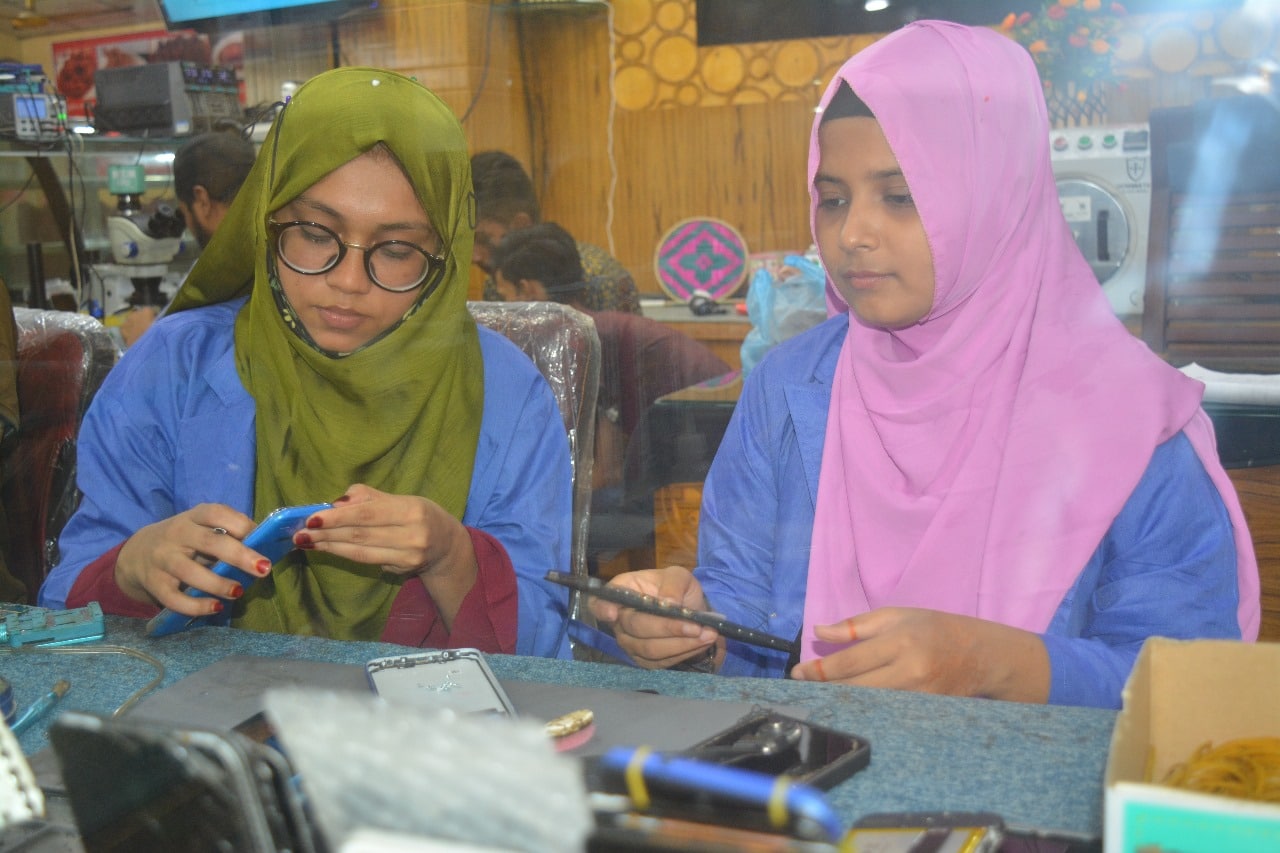 প্রশিক্ষণার্থীরা গভীর মনোযোগ দিয়ে শিখছে মোবাইল সার্ভিসিংয়ের খুঁটিনাটি, যা একসময় শুধু পুরুষদের পেশা বলে বিবেচিত হতো। কিন্তু ঘাসফুল প্রাইজ প্রকল্পের এই উদ্যোগ, নারীদের মোবাইল সার্ভিসিং পেশায় যুক্ত করে এক নতুন দিগন্তের সূচনা করেছে। পরিদর্শকরা যখন তাদের সাথে কথা বলেন, তখন প্রশিক্ষণার্থীদের মুখে আত্মবিশ্বাসের ঝিলিক স্পষ্টভাবে ফুটে ওঠে।