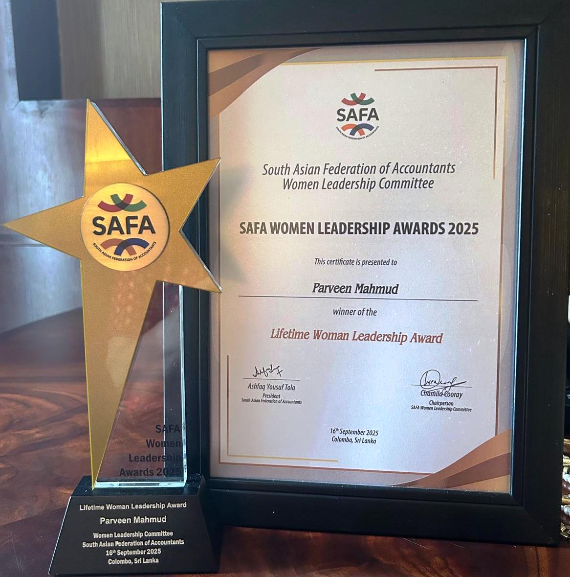 বাংলাদেশের পারভীন মাহমুদ এফসিএ ২০২৫ সালের সাউথ এশিয়ান ফেডারেশন অব একাউন্ট্যান্টস (SAFA)-র লাইফটাইম উইমেন লিডারশিপ অ্যাওয়ার্ড অর্জন করেছেন। তিনি ১৬ সেপ্টেম্বর ২০২৫ শ্রীলঙ্কার সিটি অব ড্রিমসে আয়োজিত সাফা (SAFA) ওমেন লিডারশীপ এওয়ার্ড অনুষ্ঠানে এ পুরস্কার গ্রহণ করেন।