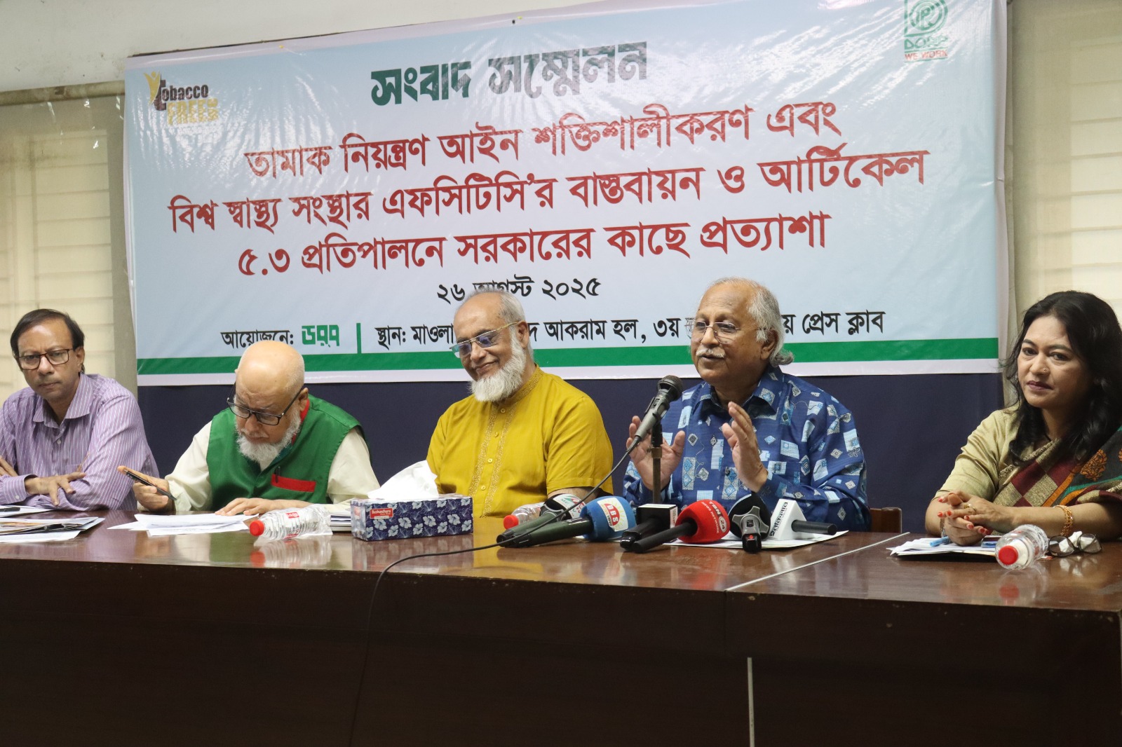 This call was made at a press conference titled “Strengthening the Tobacco Control Law and Expectations from the Government for Implementing WHO FCTC and Complying with Article 5.3”, held on Tuesday (26 August 2025) at the National Press Club in Dhaka.